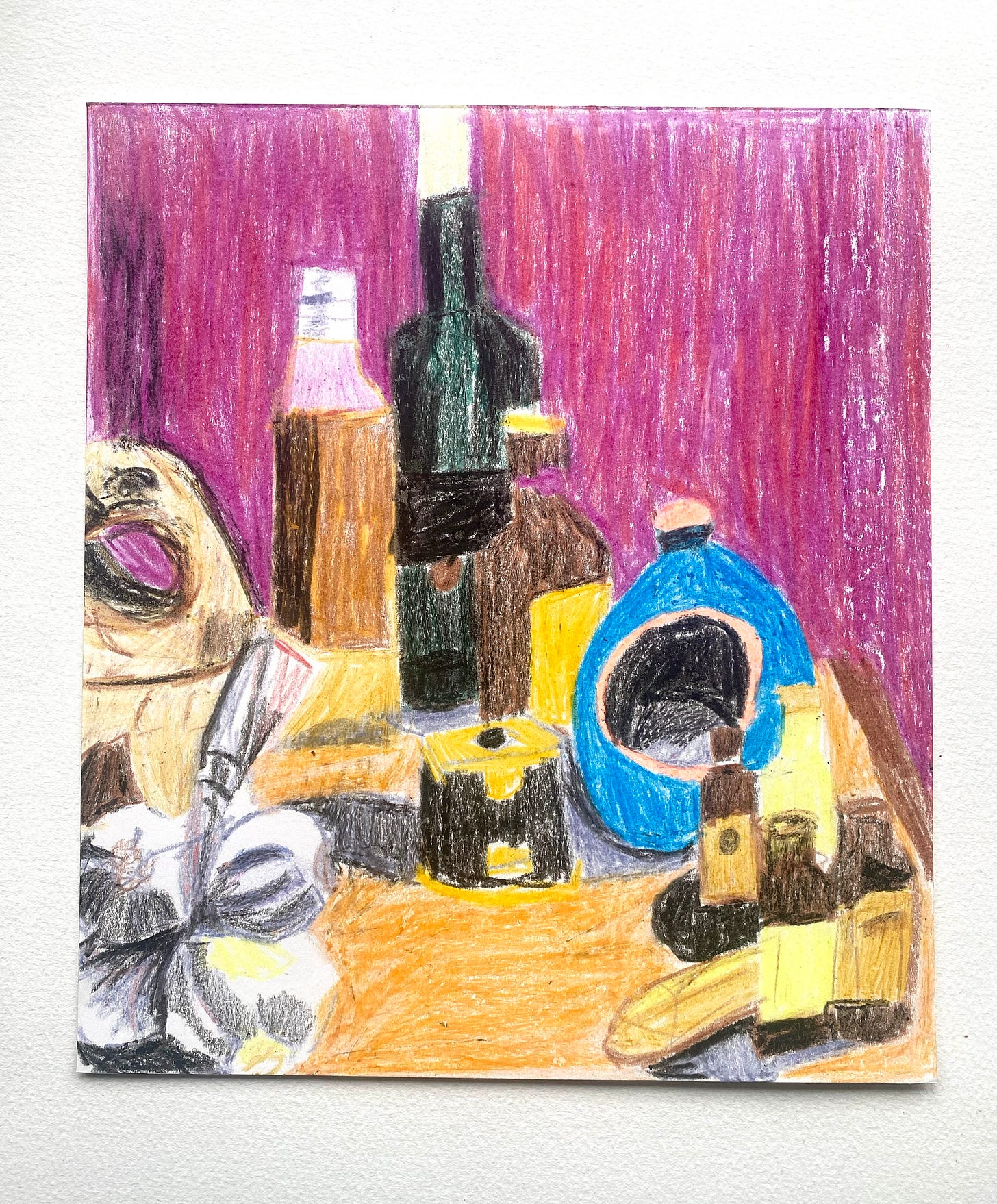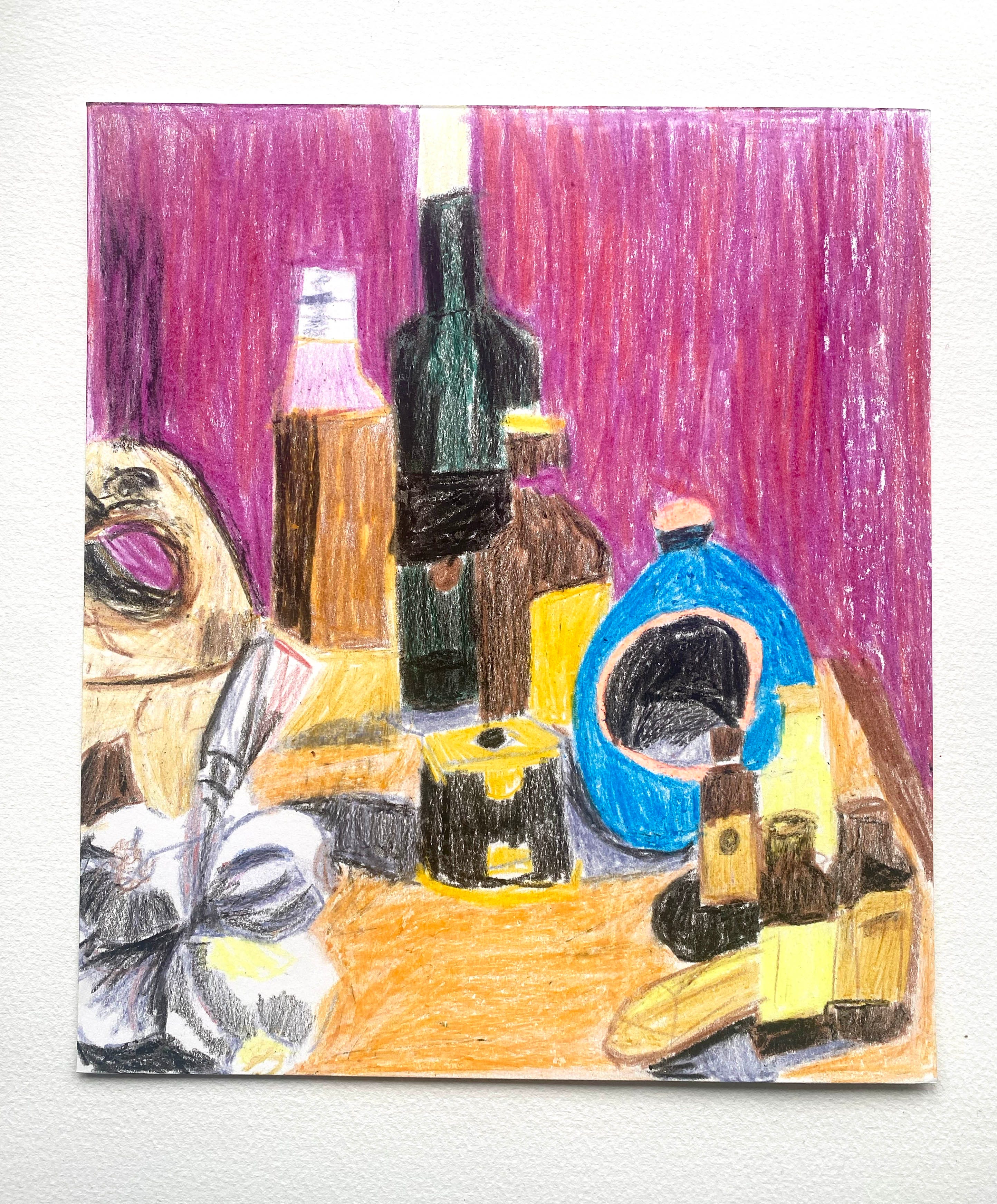When I am still trying to find paper at the start of a session I know I’m going to need something bold and quick to work with. It is not the moment to try and find paints and a water pot, it isn’t the time for a delicate pencil drawing and it definitely isn’t the moment to attempt another elaborate screen print. It’s at these moments that I reach for the trusty pot of Crayola wax crayons.